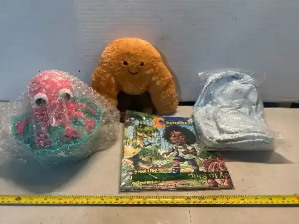 Bubble blower, stuffed toy , book and backpack