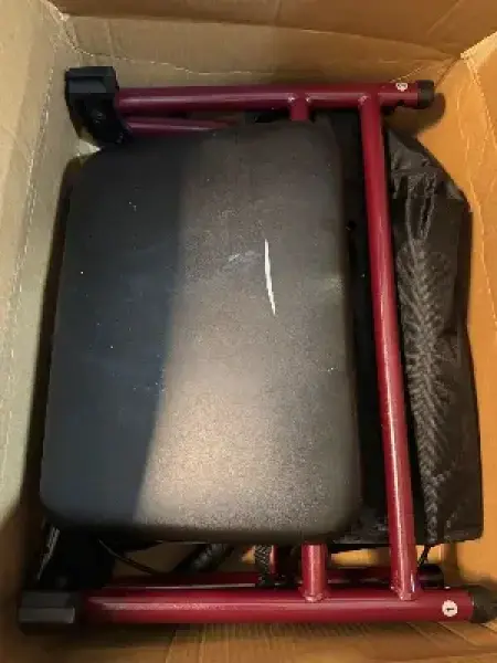 Steel rollator walker has slit in seat