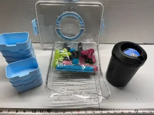 Plastic storage container(bent ) , clips, cooler mug and more