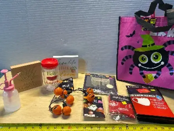 Trick or treat bag : wooden decorations (2), plastic cup, spritzer, Halloween lights and more