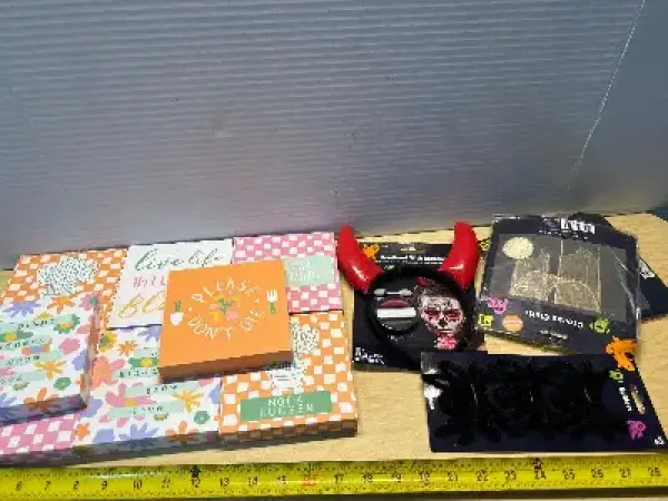 Wooden decorations (8ct), spiders, creepy cloths (2) and headband with makeup kit