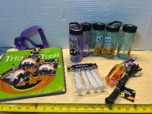 Vampire teeth (3), plastic bottles(5ct), syringes, shot glasses and skeleton arms