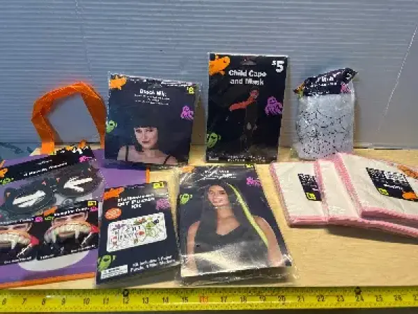Child cape/mask, wigs (2), napkins (3pks), Halloween puzzle kit and vampire teeth