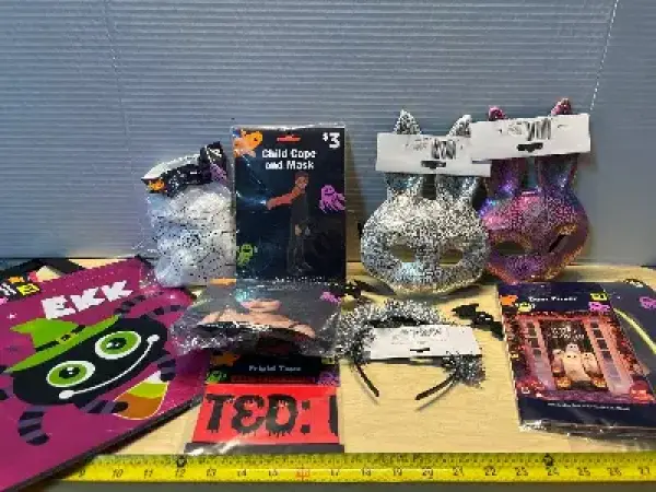 Child cape/mask, wigs(2), decorative headband , tape , and bunny masks (2)