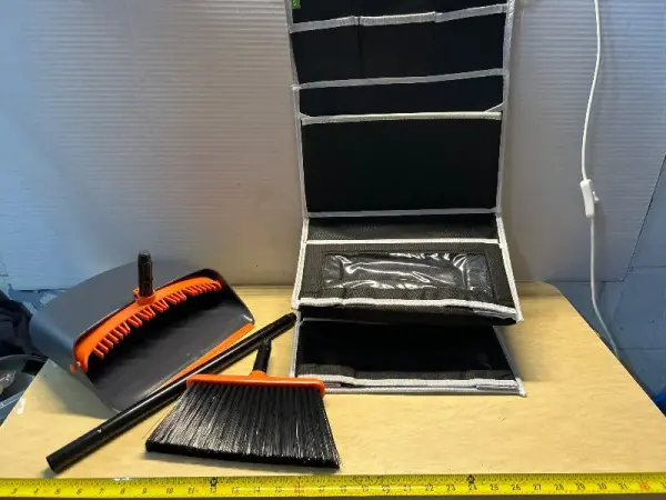 Broom/dust pan and hanging storage organizer