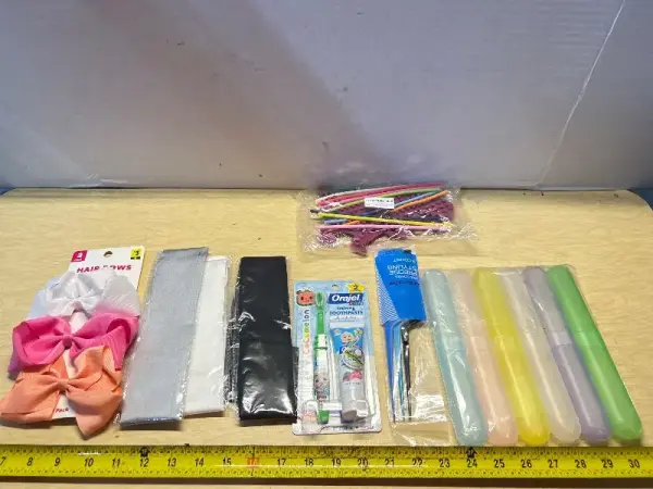 Hair bows, neck scarf chokers,kids toothbrush/paste, toothbrush holders(6), hair comb and teething activity board for kids