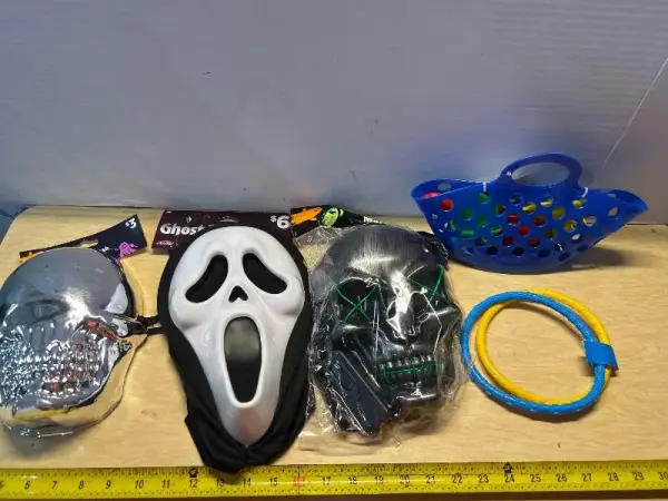 Halloween masks(3), dive rings (2) and beach tote