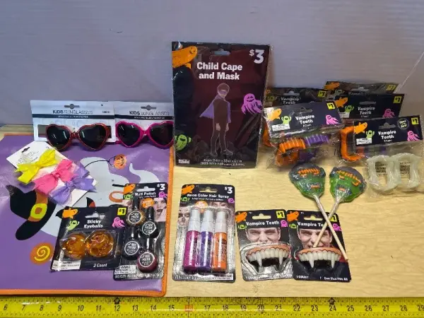 Trick or treat bag: vampire teeth, hair color spray , nail polish, hair bows, kids cape/mask and sunglasses