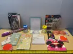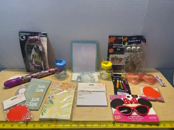 Waistband phone case, glass containers(2), dry erase board, napkins, recipe book, travel purse, Halloween decorations and mini mouse glasses