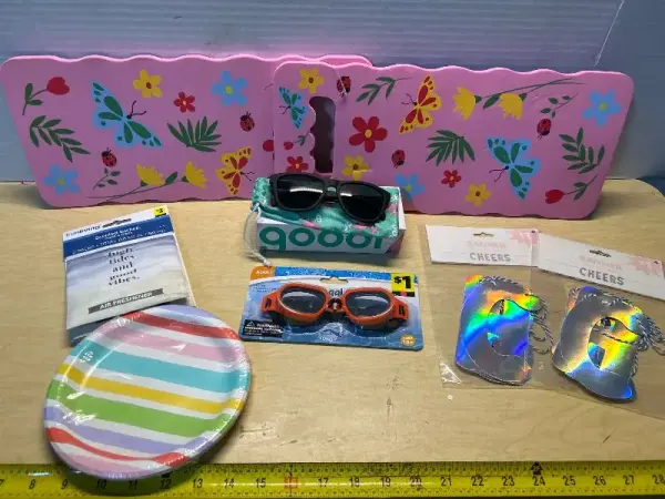 Kneeling pads(2), sunglasses, swimming goggles, party banners (2) and paper plates