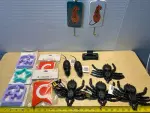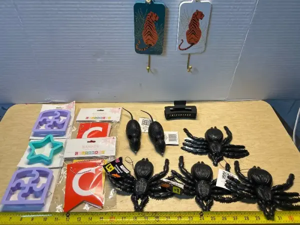 Sandwich/cookie cutters(3), party banners(2), wooden home decor (2), toy rats, toy spiders and hair clip
