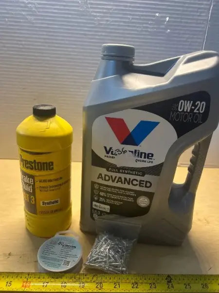 Brake fluid for 3, SAE 0W-20 motor oil (half full), stringing wire and double head skirting thread nails