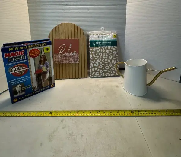 Vase, tablecloth, screen door & wall decor