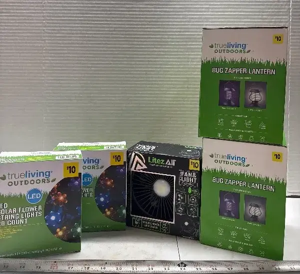 Solar powered flower string lights, fan and 2 bug zappers