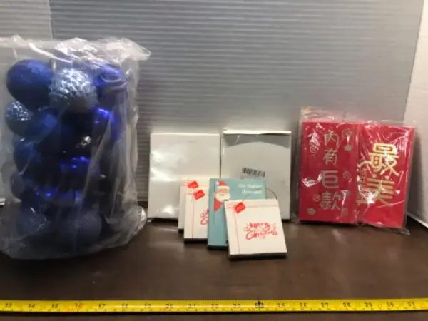 Christmas ornaments and red money envelopes