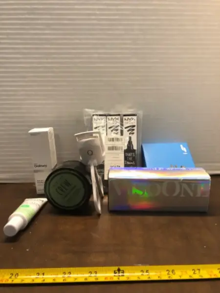 3ct eyeliner, eyelash curler , breathing aid, glasses, peeling solution, pomade anti itch vulva cream