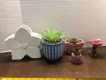 Vase, 3 faux plants , garden statue
