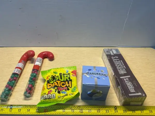 Hersheys M&M’s (2)(08/26),sour patch kids (08/07/26), chocolate coins(06/08/27) and hersheys chocolate bars (09/26)