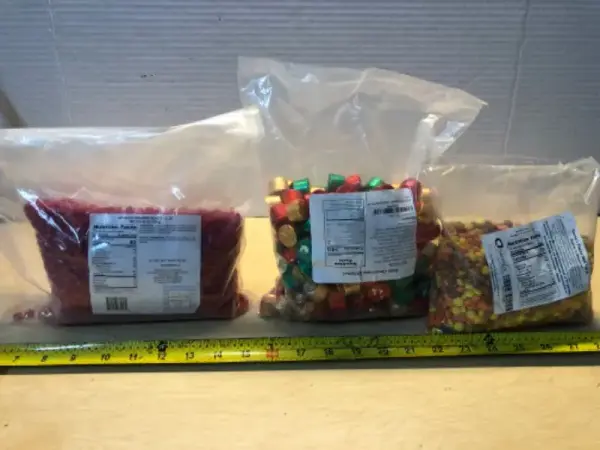 3 LB Cinnamon Hearts (opened) , Rolo chocolate caramel, 1.5 LB Reese’s Pieces mini (opened) exp: 06/2027