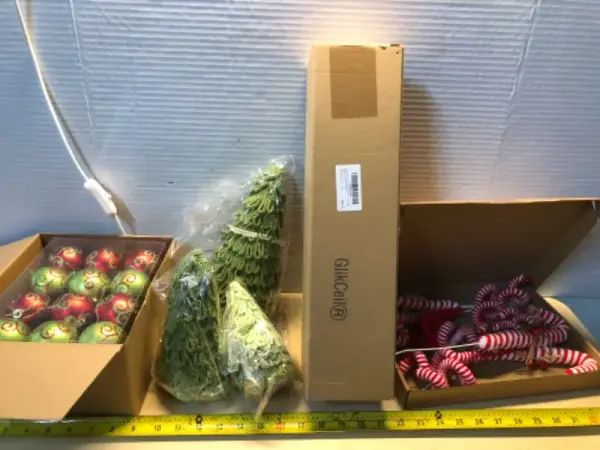 Box of Christmas balls, set of 3 Christmas trees , stocking hanger, box of candy Kane bells