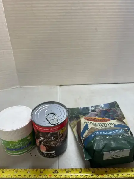 90 advanced tip and joint shoes for dogs one can of real beef, lamb and bison, wet dog food, one bag of beef and bison treats