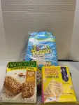 two family size boxes of fruity pebbles with marshmallows one box of nature Valley, soft baked breakfast bars, 14 pack of magic, spoon protein treats marshmallow flavor