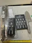 two sets of long tongs, patterned knife, three 8 piece sets of salad forks