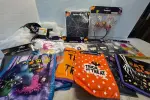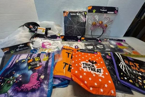 Halloween drawstring bag, gel clings, creepy cloth, hanging ghost, spider web, headband & novelty glasses