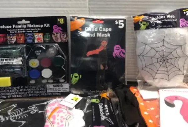 Makeup kit, table cloth, notebook, child cape, fake spiderwebs,(3) Halloween candy bags cloth, drink float
