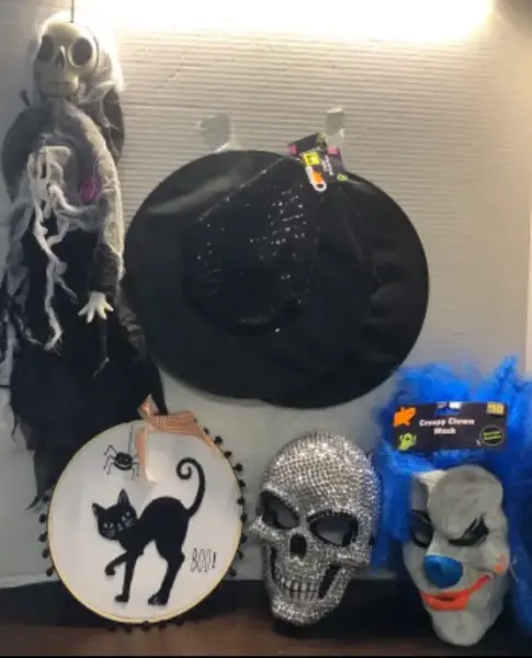 Assorted Halloween decor and (3) masks with (2) witch hats