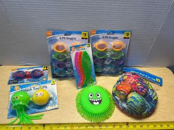 Swimming goggles(2pks), dive fish, splash toys (3) and splash ball set (4pc)