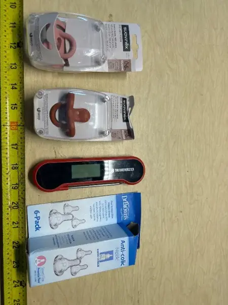 Pacifiers(2), anti colic baby bottle tops (4) and thermometer