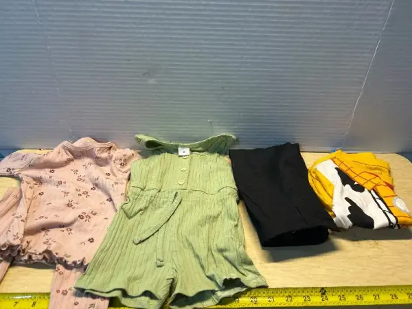 Girls outfit (18M), green suit (3Y), black slacks (2T) and woody shirt (3T)